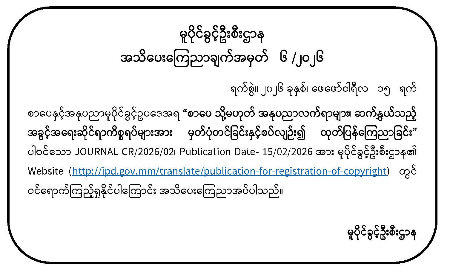 စာပေ သို့မဟုတ် အနုပညာလက်ရာများ၊ ဆက်နွှယ်သည့် အခွင့်အရေးဆိုင်ရာ ကိစ္စရပ်များအား မှတ်ပုံတင်ခြင်းနှင့် စပ်လျဉ်း၍ ထုတ်ပြန်ကြေညာခြင်း အသိပေးကြေညာချက် (၆/၂၀၂၆)