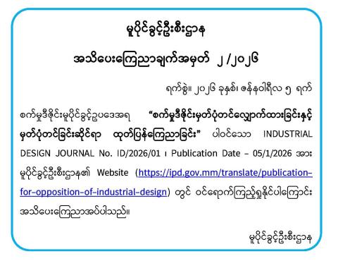 စက်မှုဒီဇိုင်းမှတ်ပုံတင်လျှောက်ထားခြင်းနှင့် မှတ်ပုံတင်ခြင်းဆိုင်ရာ ထုတ်ပြန်ကြေညာခြင်း အသိပေးကြေညာချက်အမှတ် (၂/၂၀၂၆) အောက်ဖော်ပြပါ အား အောက်ဖော်ပြပါ Link တွင် ဝင်ရောက်ကြည့်ရှုနိုင်ပါသည်-