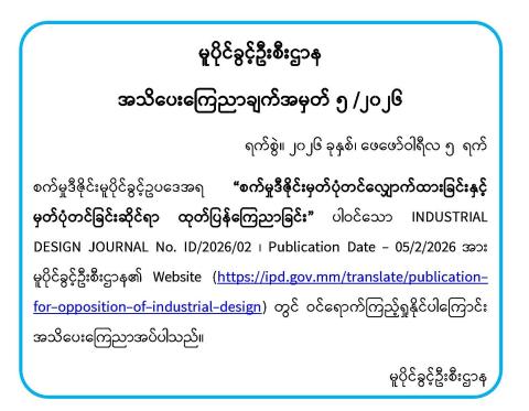စက်မှုဒီဇိုင်းမှတ်ပုံတင်လျှောက်ထားခြင်းအားကန့်ကွက်နိုင်ကြောင်းထုတ်ပြန်ကြေညာခြင်းနှင့်စက်မှုဒီဇိုင်းမှတ်ပုံတင်ခွင့်ပြုကြောင်းထုတ်ပြန်ကြေညာခြင်း ( အသိပေးကြေညာချက်အမှတ် ၂/ ၂၀၂၆)