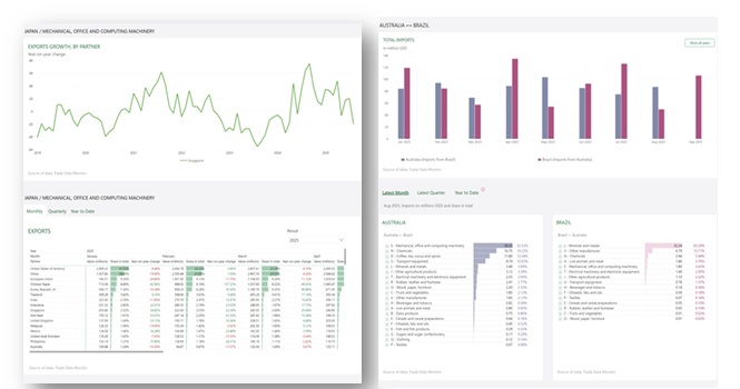WTO Monthly Merchandise Trade Statisticsဟုခေါ်သည့် ပလက်ဖောင်းတွင် အသုံးပြုသူများအတွက် ကုန်သွယ်မှုလမ်းကြောင်းများကိုရှာဖွေပြီးသုံးသပ်နိုင်ရန် အောက်ပါ Dashboard ၃ ခုဖြင့် ဖွဲ့စည်းထားပါသည်-