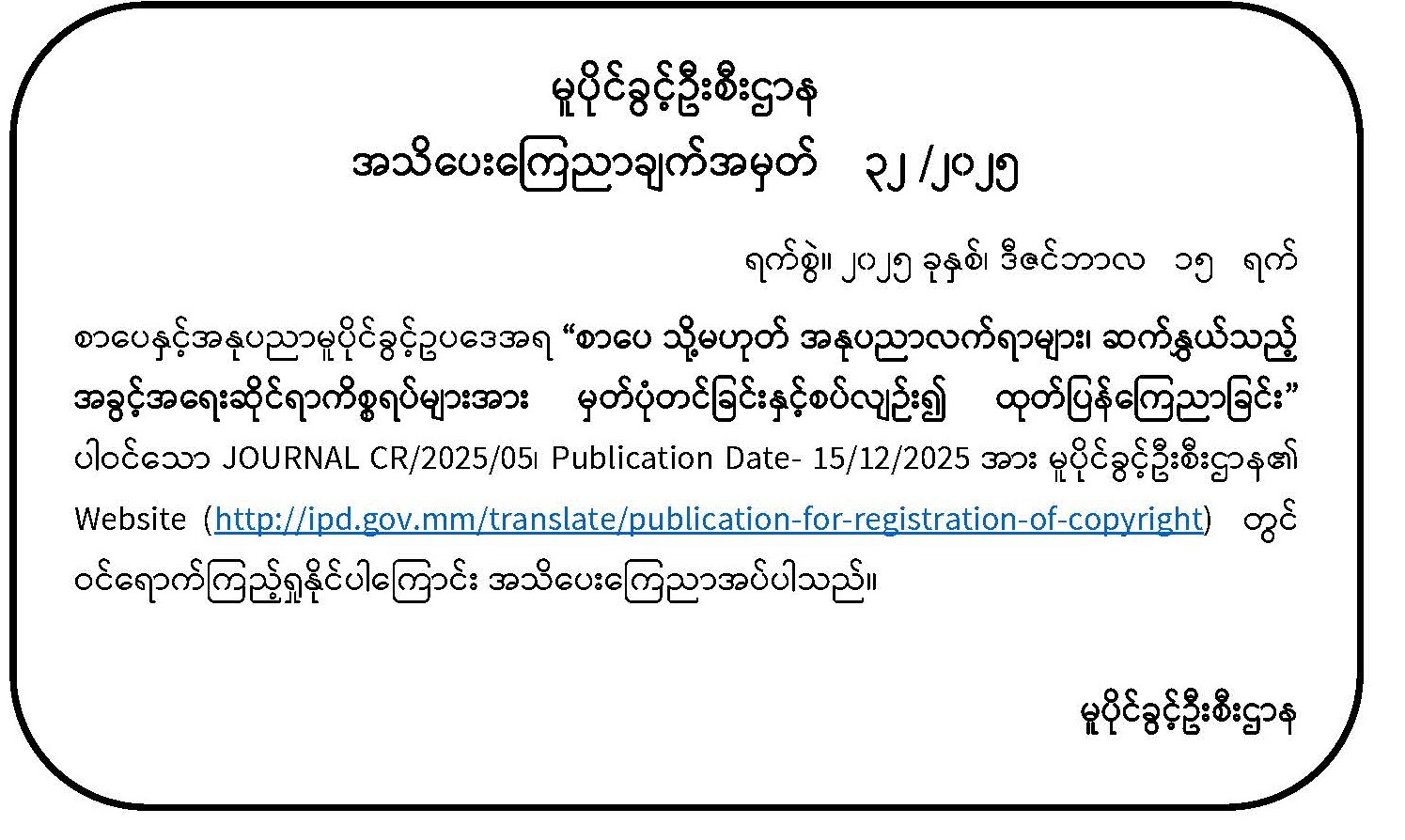 စာပေ သို့မဟုတ် အနုပညာလက်ရာများ၊ ဆက်နွှယ်သည့်အခွင့်အရေးဆိုင်ရာကိစ္စရပ်များအား မှတ်ပုံတင်ခြင်းနှင့်စပ်လျဉ်း၍ ထုတ်ပြန်ကြေညာခြင်းအသိပေးကြေညာချက်အမှတ်(၃၂/၂၀၂၅)နှင့်စပ်လျဉ်း၍ အောက်ဖော်ပြပါ Link တွင် ဝင်ရောက်ကြည့်ရှုနိုင်ပါသည်-