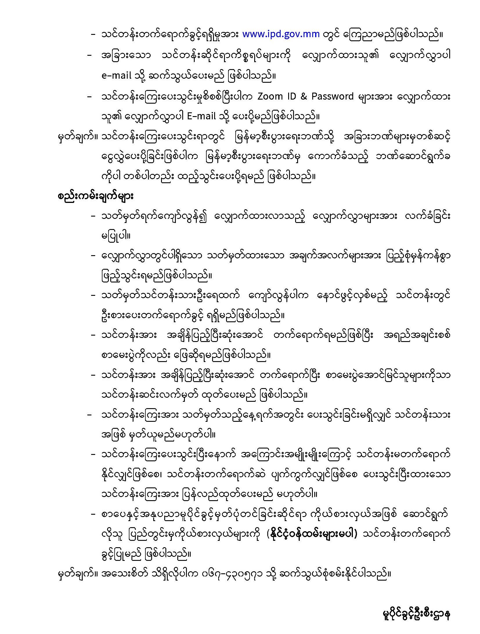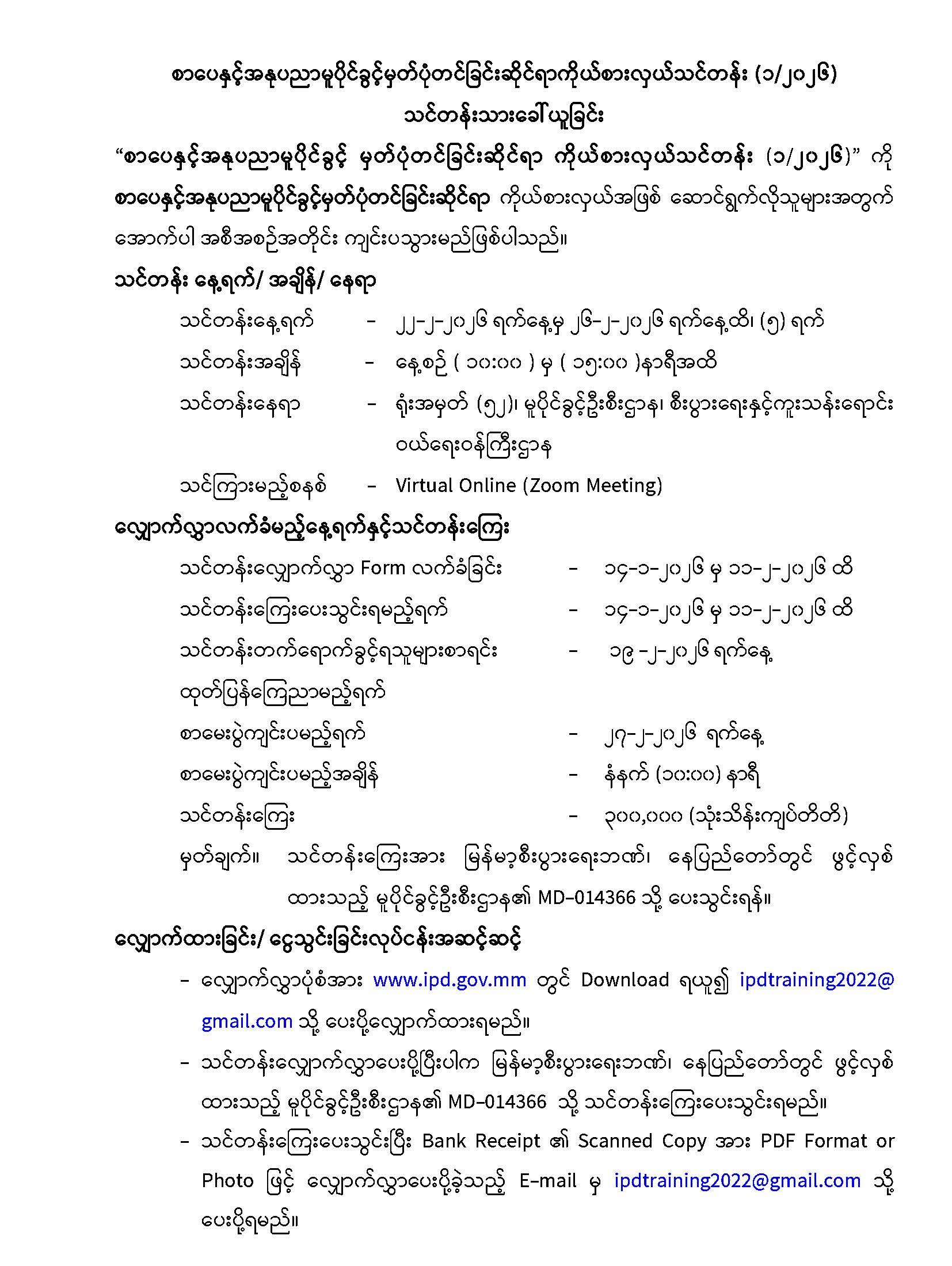စာပေနှင့်အနုပညာမူပိုင်ခွင့်မှတ်ပုံတင်ခြင်းဆိုင်ရာကိုယ်စားလှယ်သင်တန်း(၁/၂၀၂၆) သင်တန်းသားခေါ်ယူခြင်း ipICTdep Wed, 01/14/2026 - 09:48