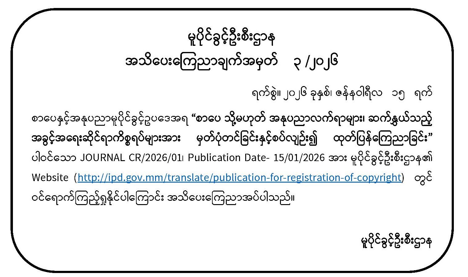 စာပေ သို့မဟုတ် အနုပညာလက်ရာများ၊ ဆက်နွှယ်သည့်အခွင့်အရေးဆိုင်ရာကိစ္စရပ်များအား မှတ်ပုံတင်ခြင်းနှင့်စပ်လျဉ်း၍ ထုတ်ပြန်ကြေညာခြင်း အသိပေးကြေညာချက်အမှတ် (၃/၂၀၂၆)အား အောက်ဖော်ပြပါ Link တွင် ဝင်ရောက်ကြည့်ရှုနိုင်ပါသည်-