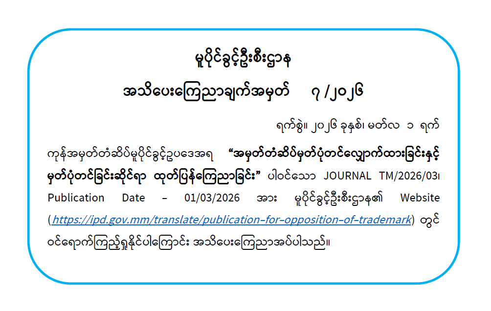 အမှတ်တံဆိပ်မှတ်ပုံတင် လျှောက်ထားခြင်းအား ကန့်ကွက်နိုင်ကြောင်း ထုတ်ပြန်ကြေညာခြင်း နှင့်  အမှတ်တံဆိပ်မှတ်ပုံတင်လျှောက်ထားခြင်းအား မှတ်ပုံတင်ပြီးကြောင်း ထုတ်ပြန်ကြေညာခြင်း (အသိပေးကြေညာချက်အမှတ် ၇/၂၀၂၆) နှင့်စပ်လျဉ်း၍ အောက်ဖော်ပြပါ Link တွင် ဝင်ရောက်ကြည့်ရှုနိုင်ပါသည်-https://ipd.gov.mm/translate/publication-for-opposition-of-trademark